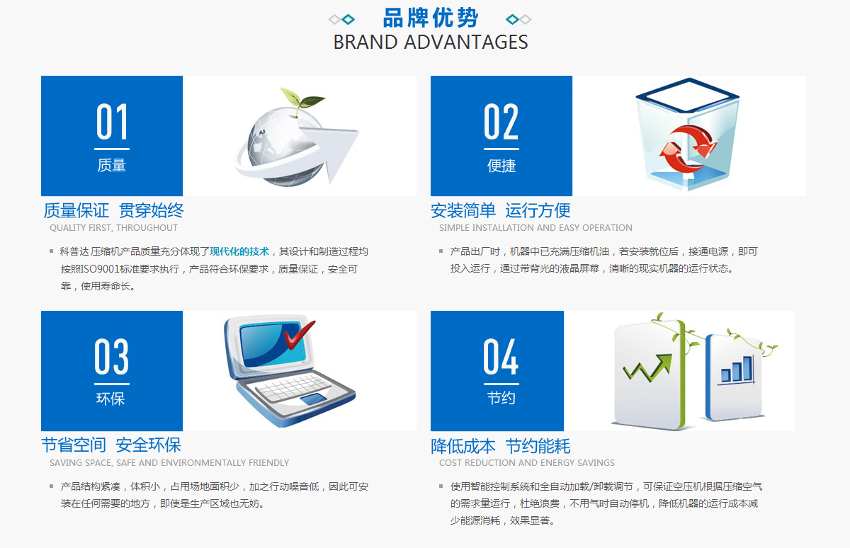 | 空壓機在工廠維護中主要需求和應(yīng)用 |  | 購買空壓機需要考慮什么 |  | 科普達教您空壓機保養(yǎng)八步走 |  | 螺桿空壓機取代活塞機的原因 |  | 如何確保永磁變頻空壓機電機不退磁? |  | 空壓機行業(yè)新貴!永磁空壓機6大亮點 |